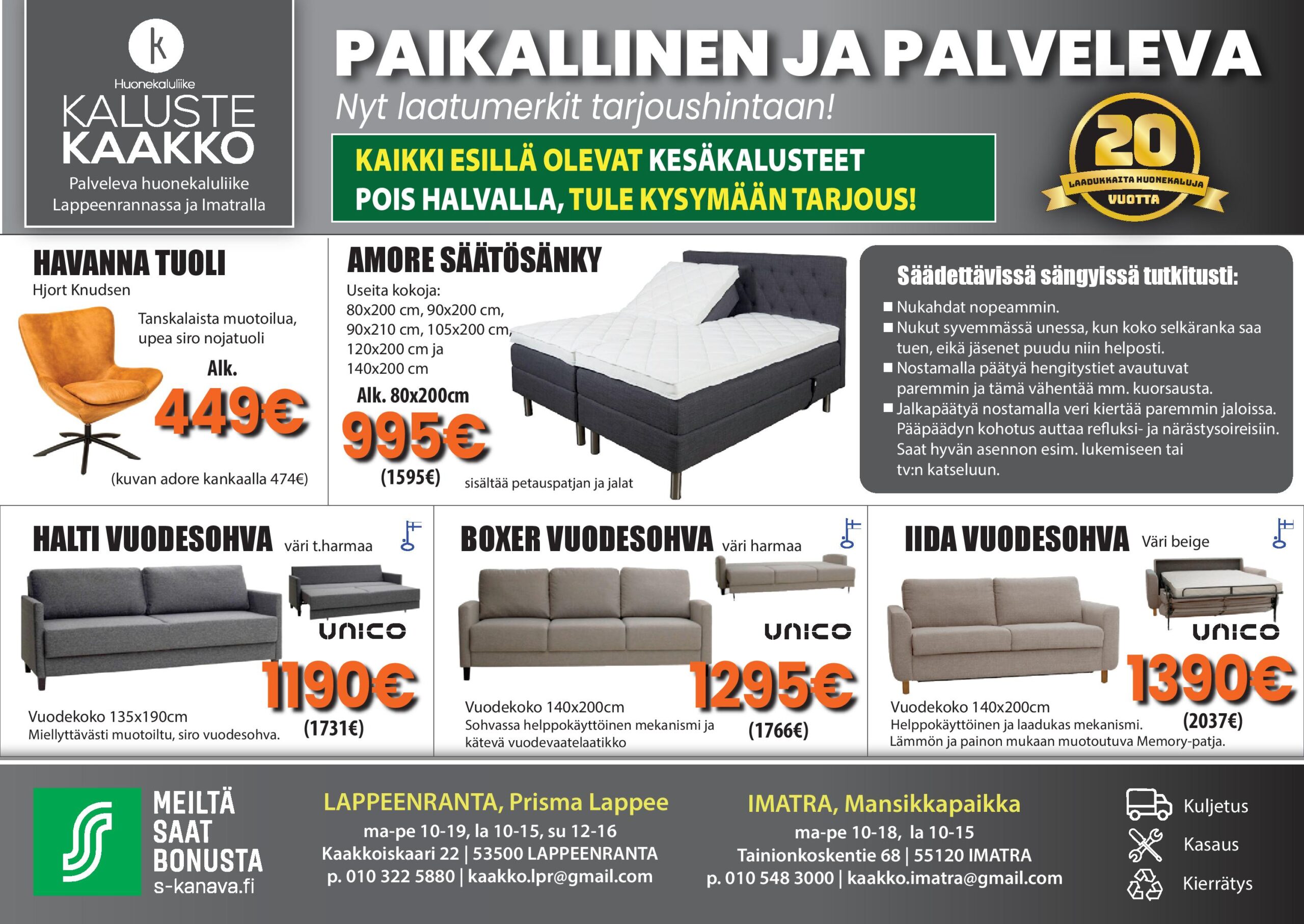 Mainoksen tuotteet: Havanna tuoli, Amore säätösänky, Halti vuodesohva, Boxer vuodesohva ja Iida vuodesohva